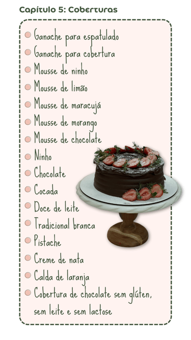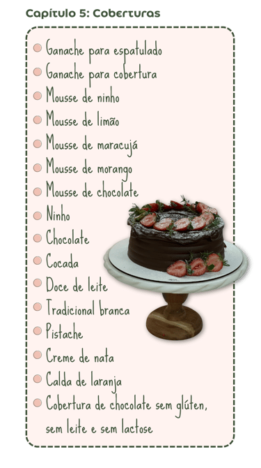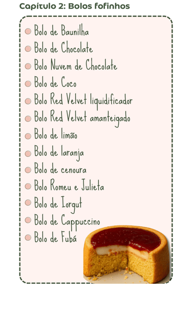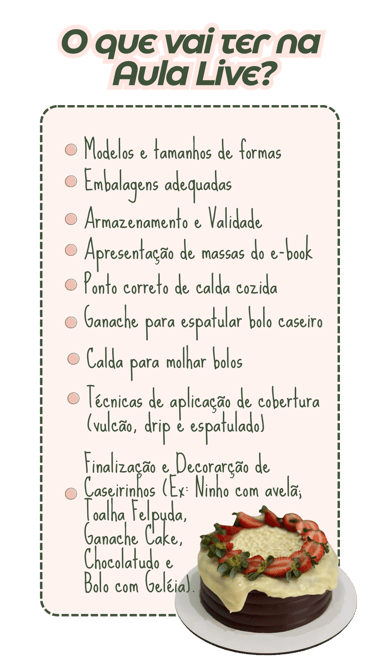 Além da Aula Live Bolos Caseiros 2.0, você ainda vai receber o E-book Bolos Caseiros Atualizado 📖